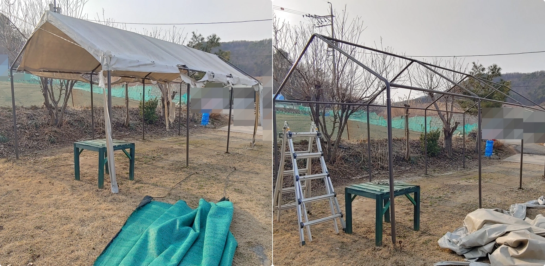 그럼 이제 골조만 남겨두고 차광막과 찢어진 천을 해체합니다.