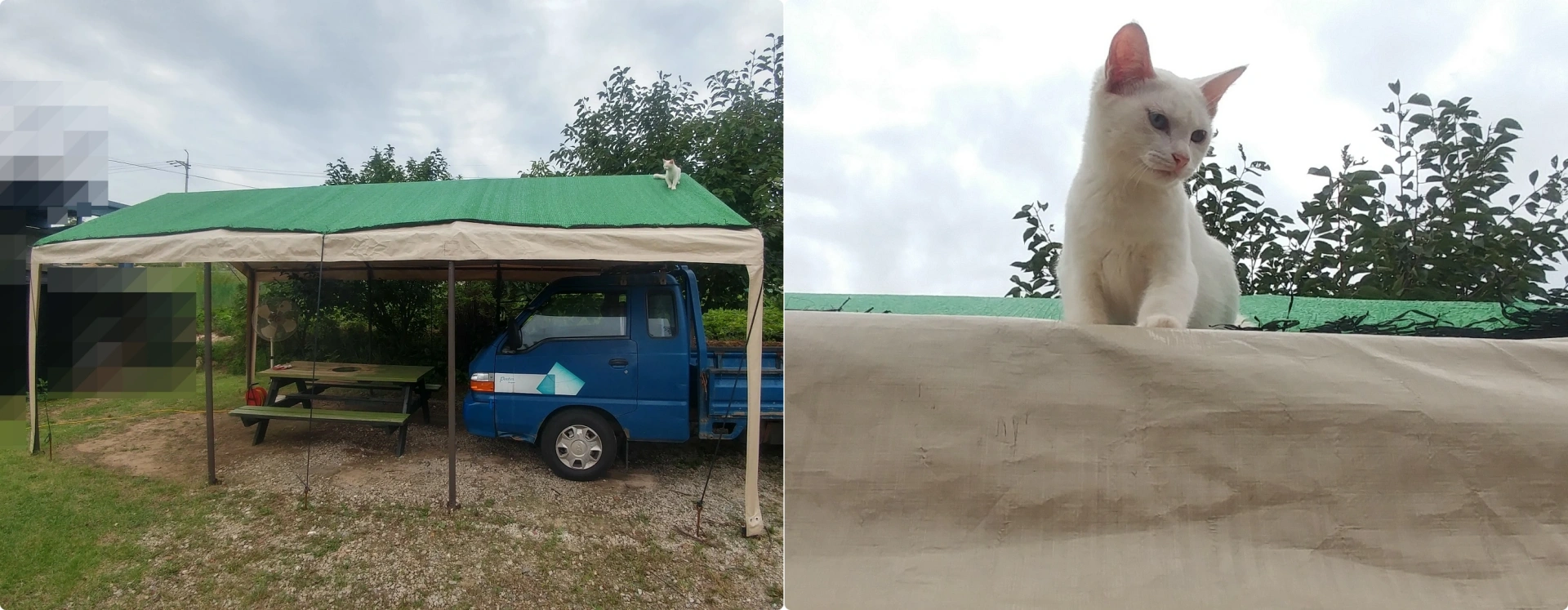 지붕의 가장 높은 양쪽의 꼭짓점 중 앞사진의 차광막이 짧아서 덮이지 않은 쪽은 찢어졌는데 차광막이 덮인 반대쪽은 찢어지지 않았습니다. 뭐 그렇다고 계속 더 쓸 수 있는 정도는 아니지만...