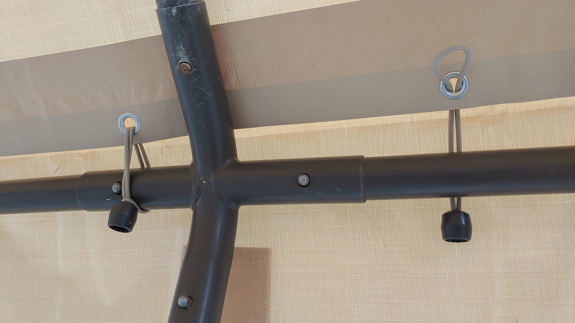 특별한 공구가 필요 없이 이렇게 고무줄로 천과 골조를 연결해 고정시켜 줍니다. PE천이 이중으로 덧대있어 힘주어 당겨도 찢어지거나 실밥이 터질 걱정 없이 만듦새가 괜찮습니다.