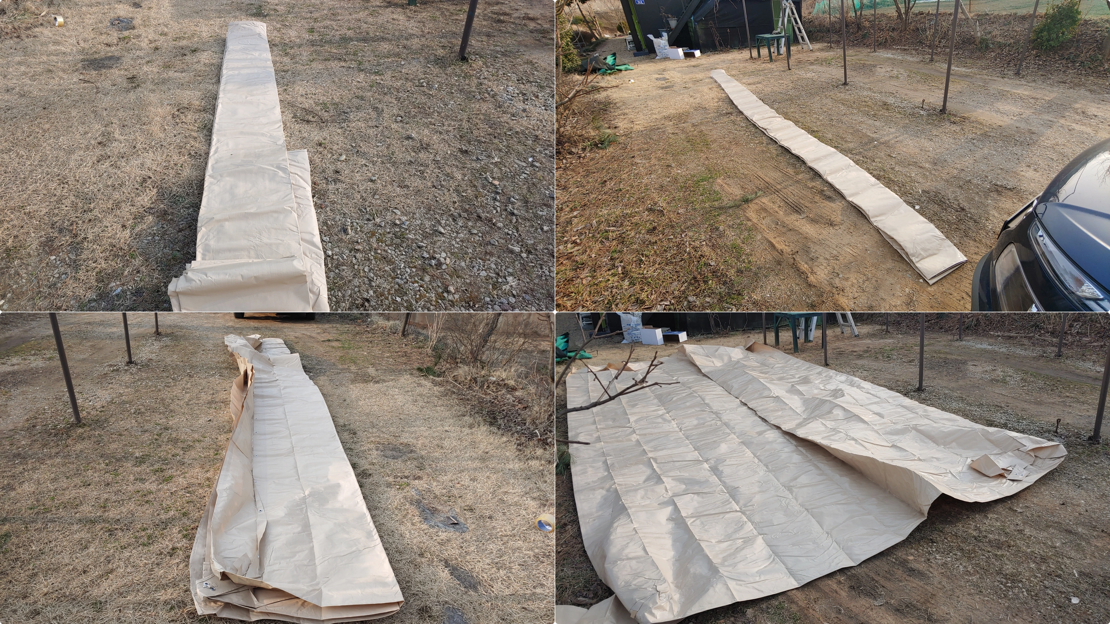 먼저 사진처럼 골조의 긴 길이(6미터) 방향 옆에서 천을 펴준 후,