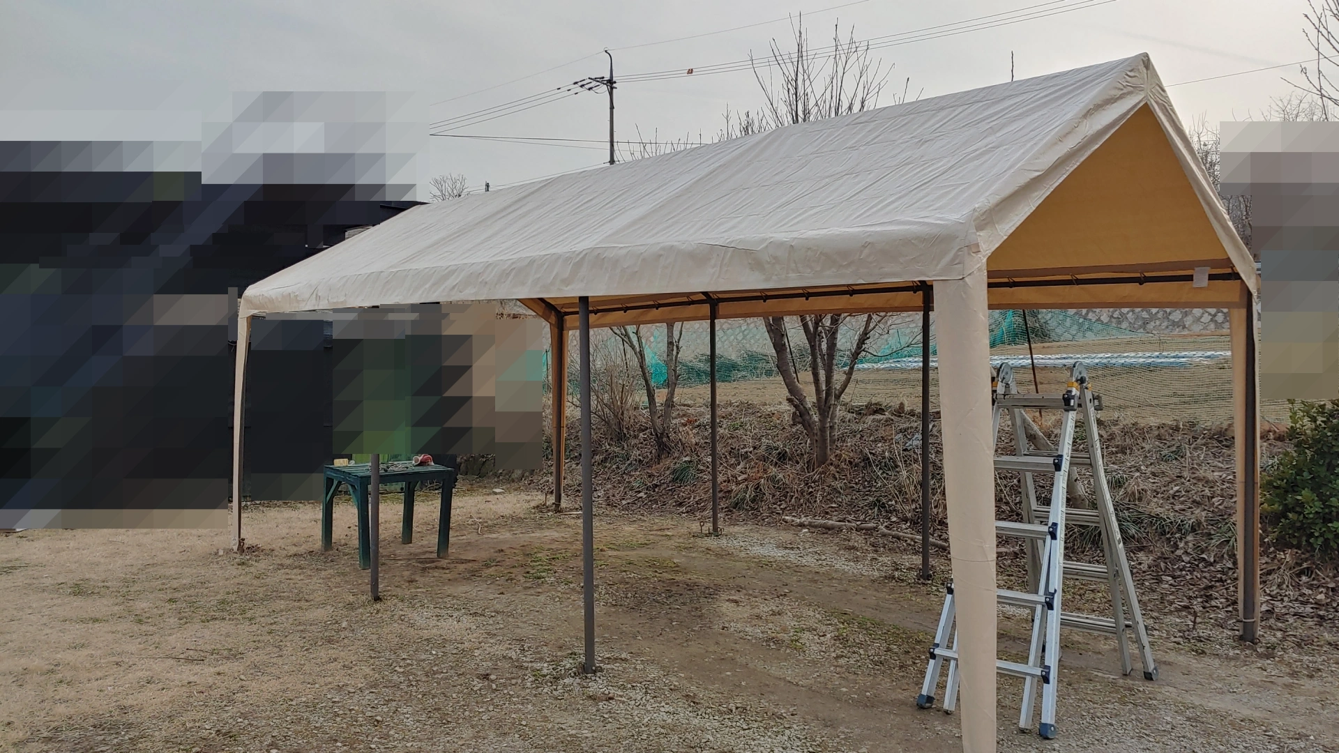 시골집 마당에 설치된 간이천막이 있습니다. 주차, 캠프, 그늘막, 비가림, 임시창고, 야외작업 등등 다양한 용도로 사용하고 있는데요, 특별한 공구가 필요 없이 비교적 쉬운 조립방식으로 몇 시간 만에 설치할 수 있고 무엇보다 농지법, 건축법에서 자유로워 전원마을에서 많이 사용하고 있는 제품입니다.