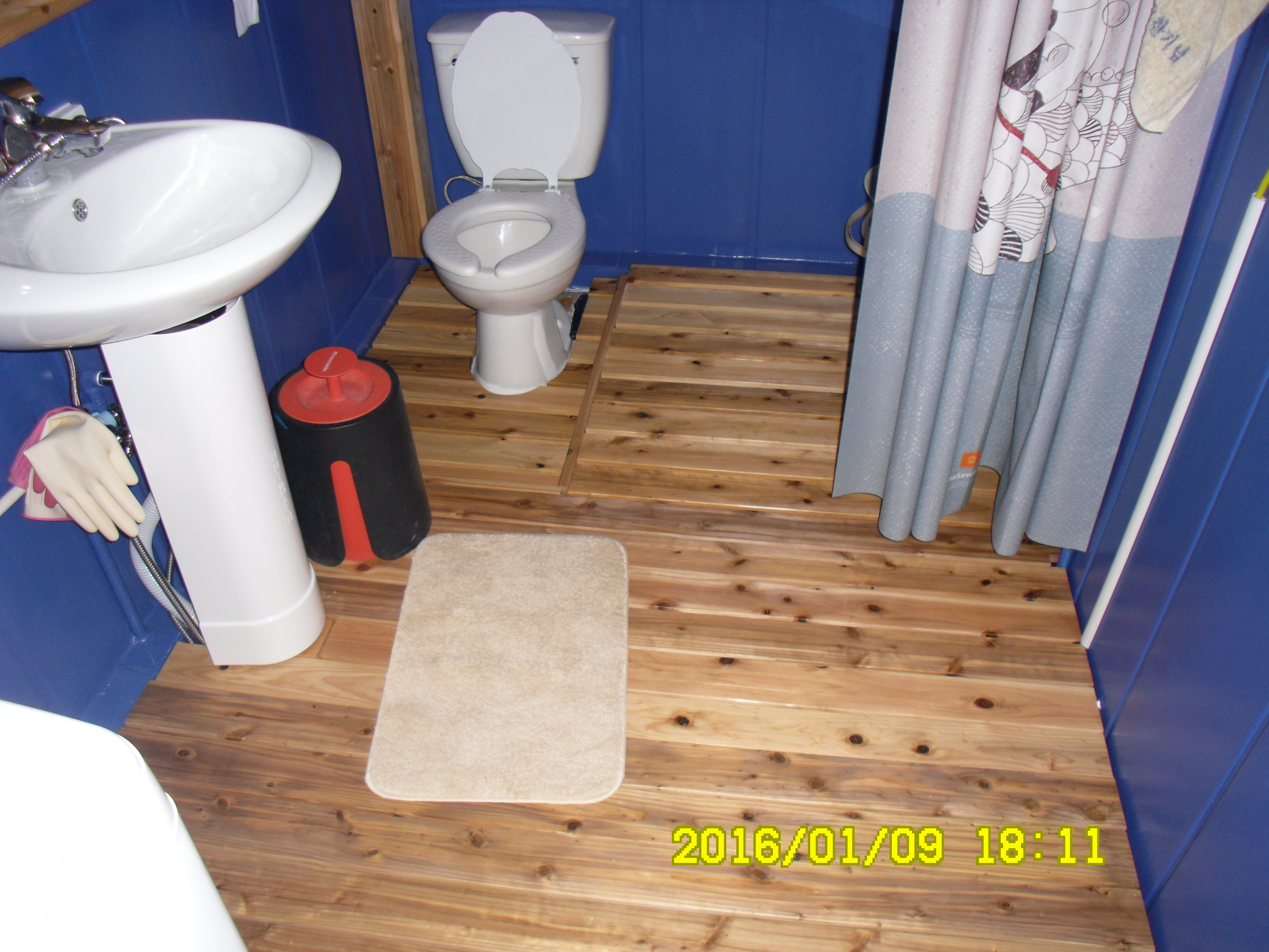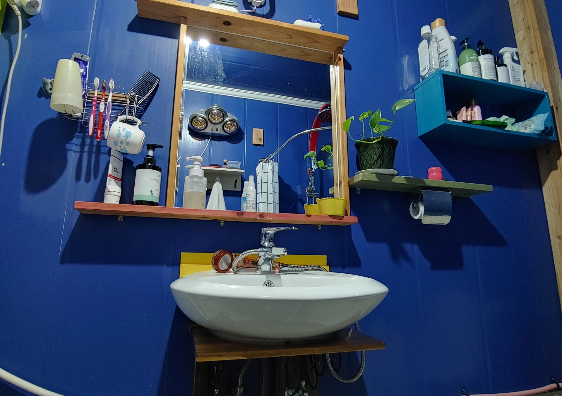 선반받침대 설치는 철판피스로 샌드위치패널에도 비교적 고정이 잘되며 사진처럼 나무패널을 덧대주면 더욱 보강이 되어 구조적으로 안정감을 줍니다. 세면볼을 얹은 목재패널은 아카시아 집성목으로 다른 작업하고 남은 자투리를 이용, 세면볼이 수평되게 앉히도록 직소를 이용해 중간 부분을 도려냈고 목재 부분은 방수를 위해 본덱스 요트바니쉬를 칠해줬습니다.