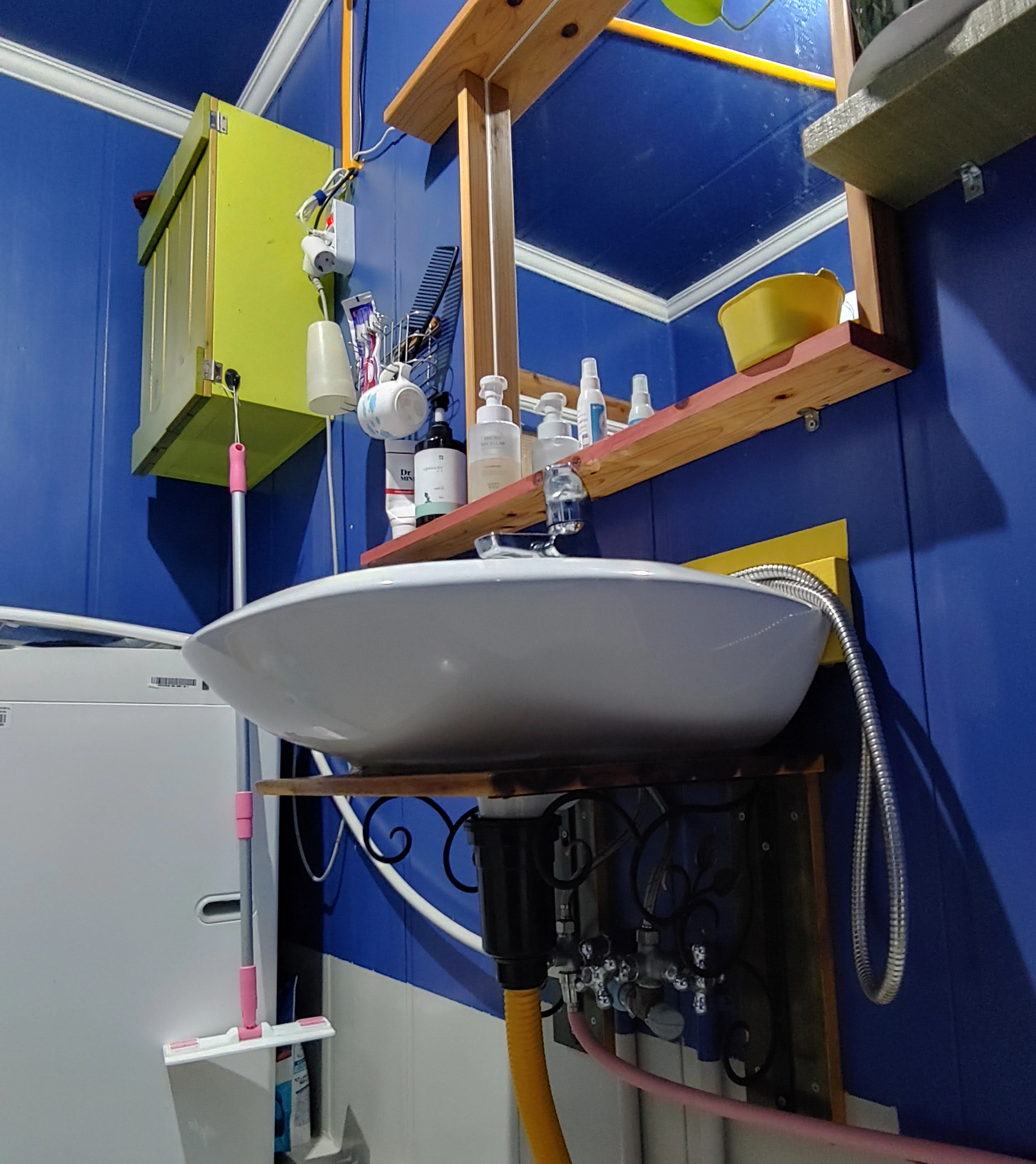 여기서 설치상의 문제가 있었는데요, 화장실 벽이 밖은 샌드위치 패널 안쪽으로는 10m 정도의 방수패널을 덧댄 구조입니다. 이런 벽에 볼트를 박으면 콘크리트벽일 때처럼 단단히 고정이 되질 않더군요. 부실한 상태로 고정된 볼트에 세면대를 체결하니 화장실 사용 중 세면기의 다리를 건드리기라도 하면 그 충격이 세면대와 체결된 볼트에도 전달이 되고 시간이 흐르며 반복되는 충격에 고정부위가 점차 헐거워지면서 세면볼이 이리저리 들썩거리기 일쑤입니다.