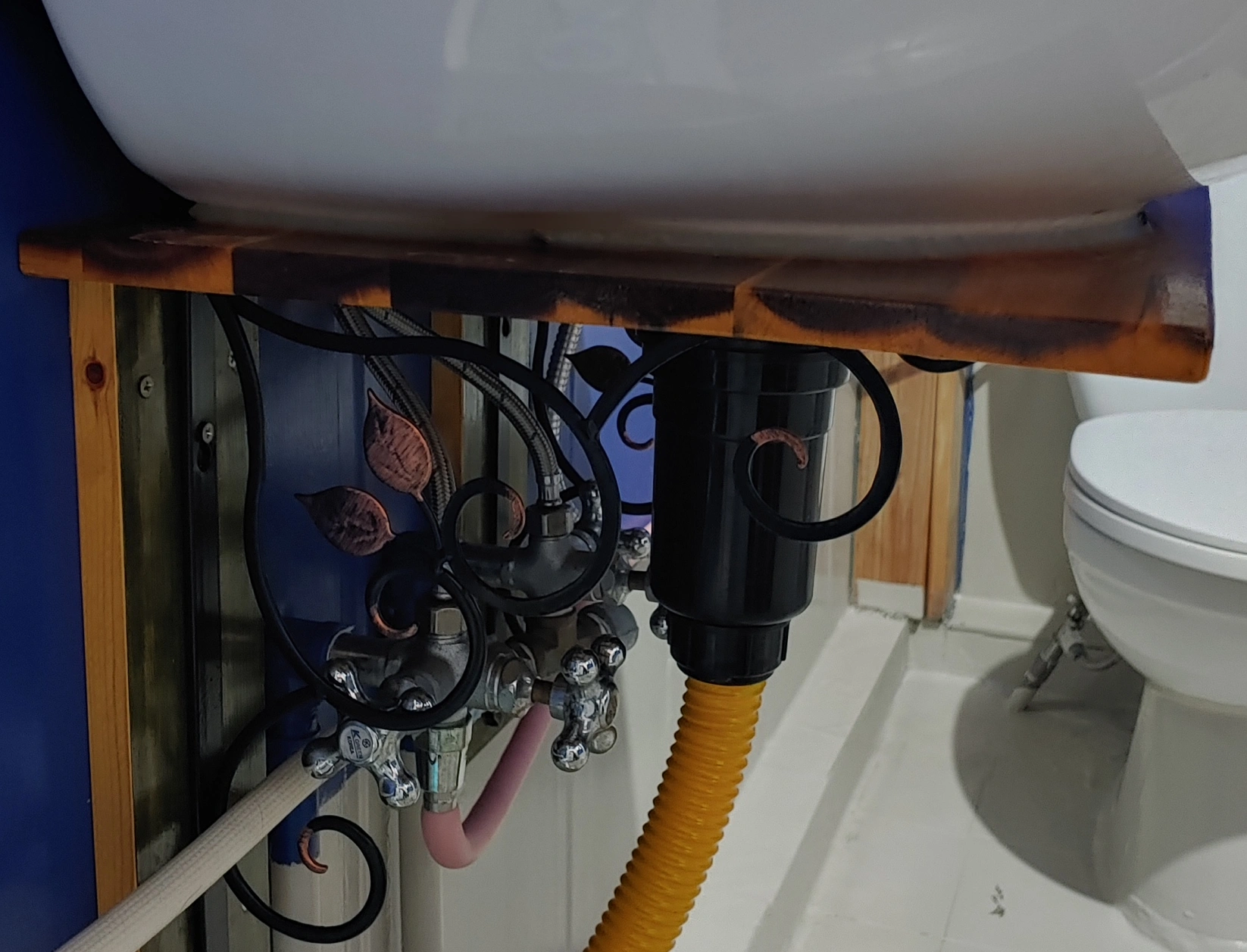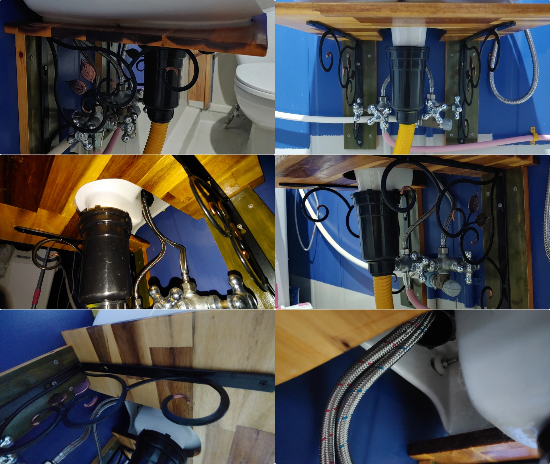 선반받침대(까치발)는 북유럽풍(?)의 엔틱한 느낌의 주물제품을 사용했습니다. 배수호스는 원래 흰색이었는 데 사용한 지 오래돼 지저분하고 촌스러운 느낌이 있어 락카칠을 해 깨끗한 느낌의 색상으로 바꿔봤습니다.