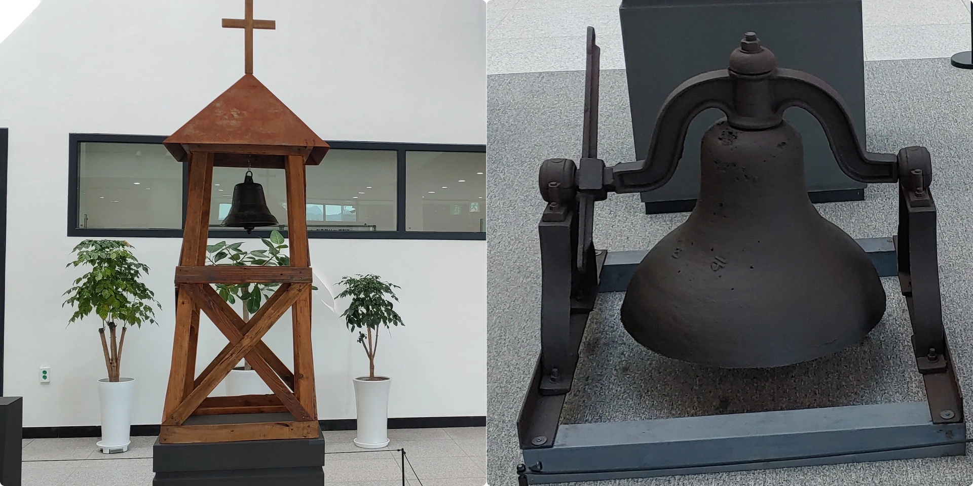 태평양전쟁을 일으킨 일본은 당시 군수물자가 부족해지자 교회의 종이나 민가의 놋그릇 등 쇠붙이들을 모두 수탈해 감으로 대부분의 교회들이 종을 빼앗겼지만 몇몇의 교회들은 이를 피하기 위해 교회 마루장을 거둬내고 땅을 파 숨겼는데, 여기에 전시된 종이 그렇게 남겨진 강화도내 어느 교회의 종으로 100년의 슬픈 역사를 가진 종이라고 합니다.