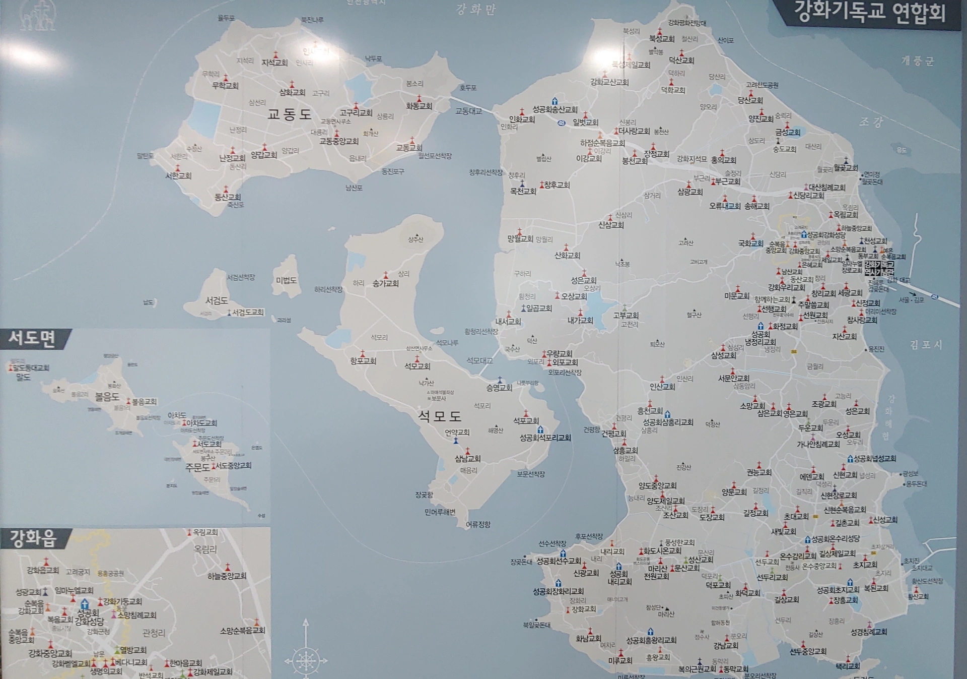 1층 로비 한쪽 벽에 전시된 강화도에 있는 교회 분포 지도입니다.