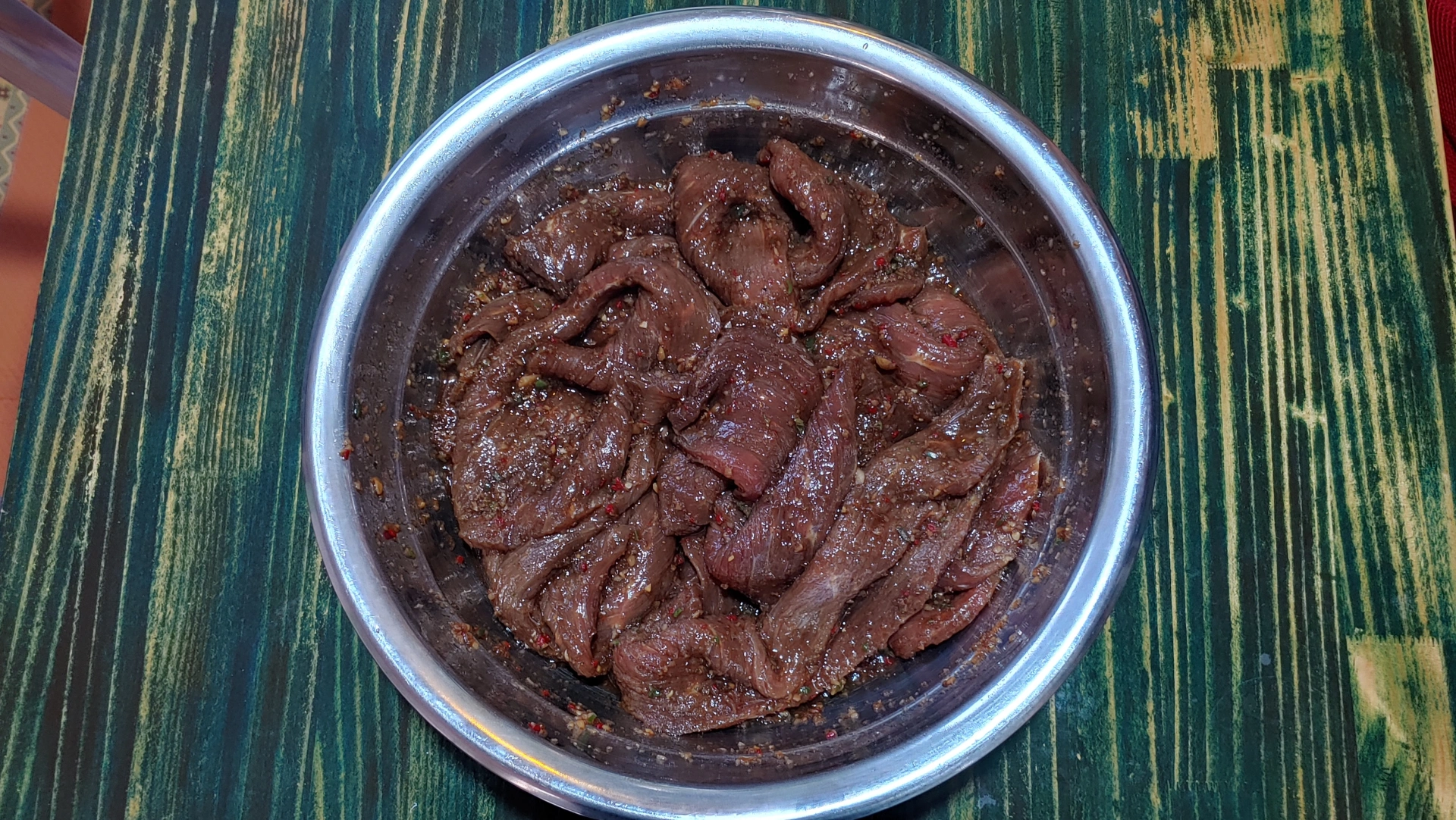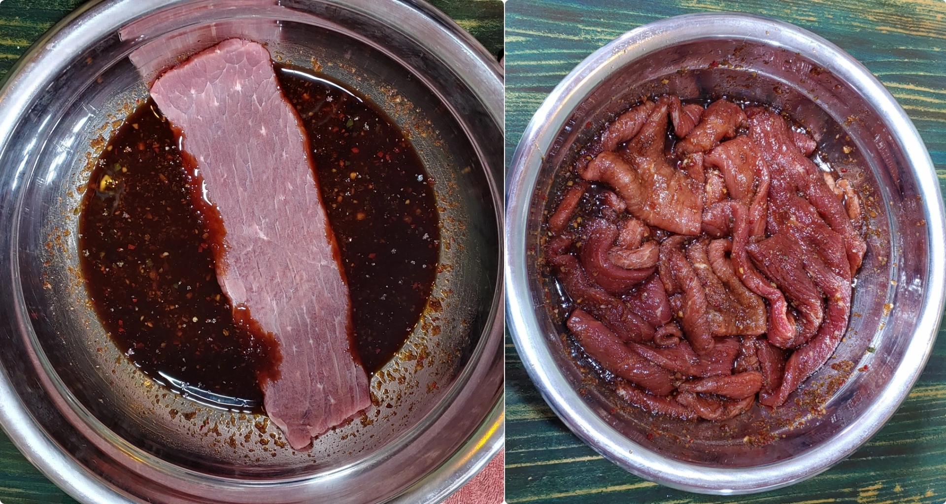 이제 물기를 제거한 육포용 고기를 양념소스에 투하,