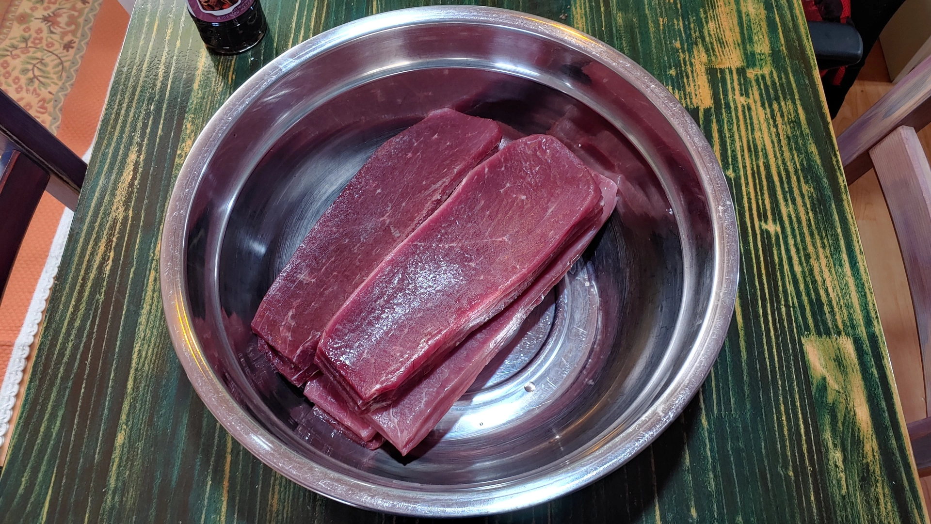 언 상태에서 서로 붙어있는 고기를 억지로 떼어내면 육포결이 안 좋게 나오니 녹아서 자연스럽게 떨어지도 해주세요.