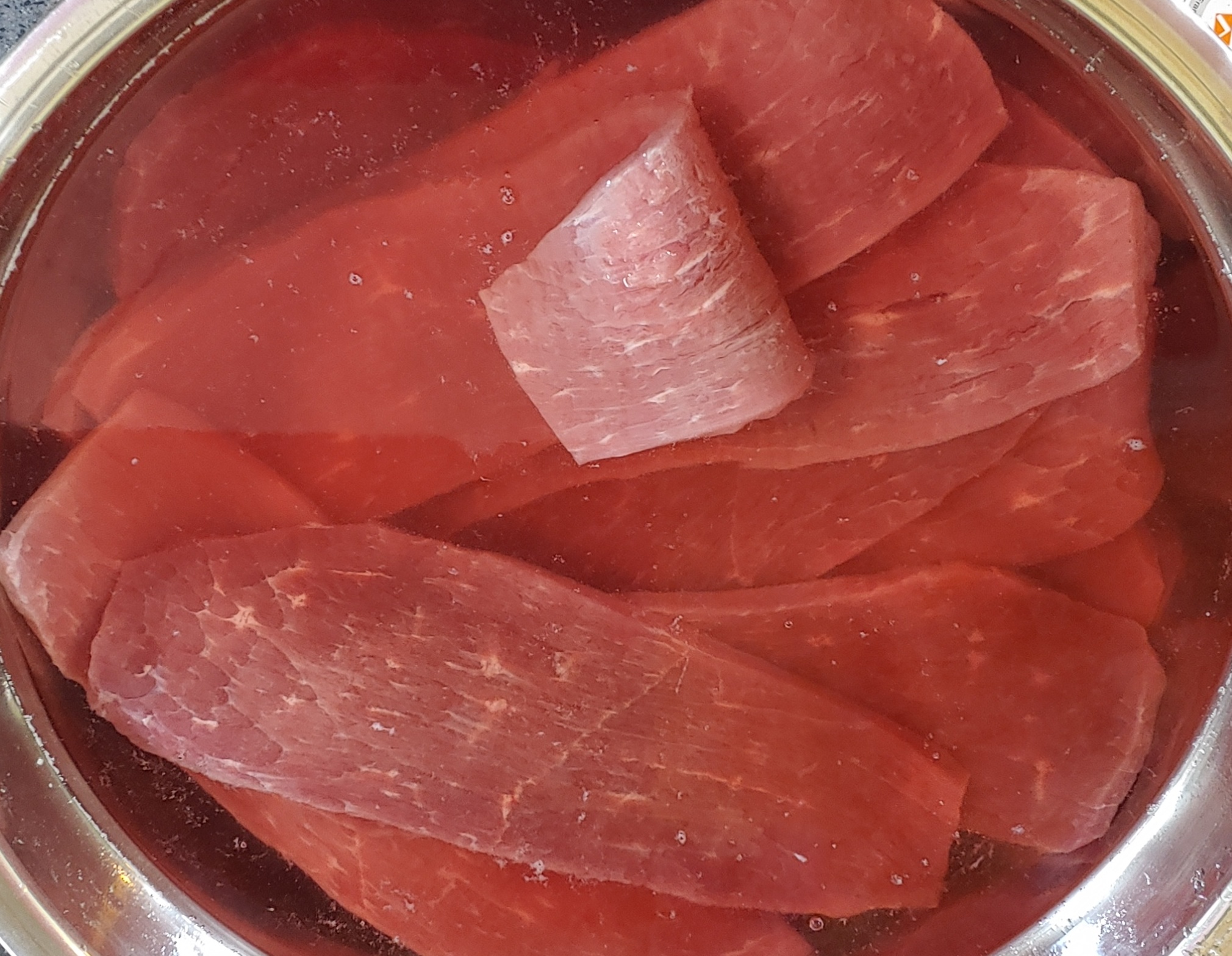 육포용 고기를 물에 담근 후 수시로 물교체하며 한나절동안 핏물을 빼준 후 육포 작업.