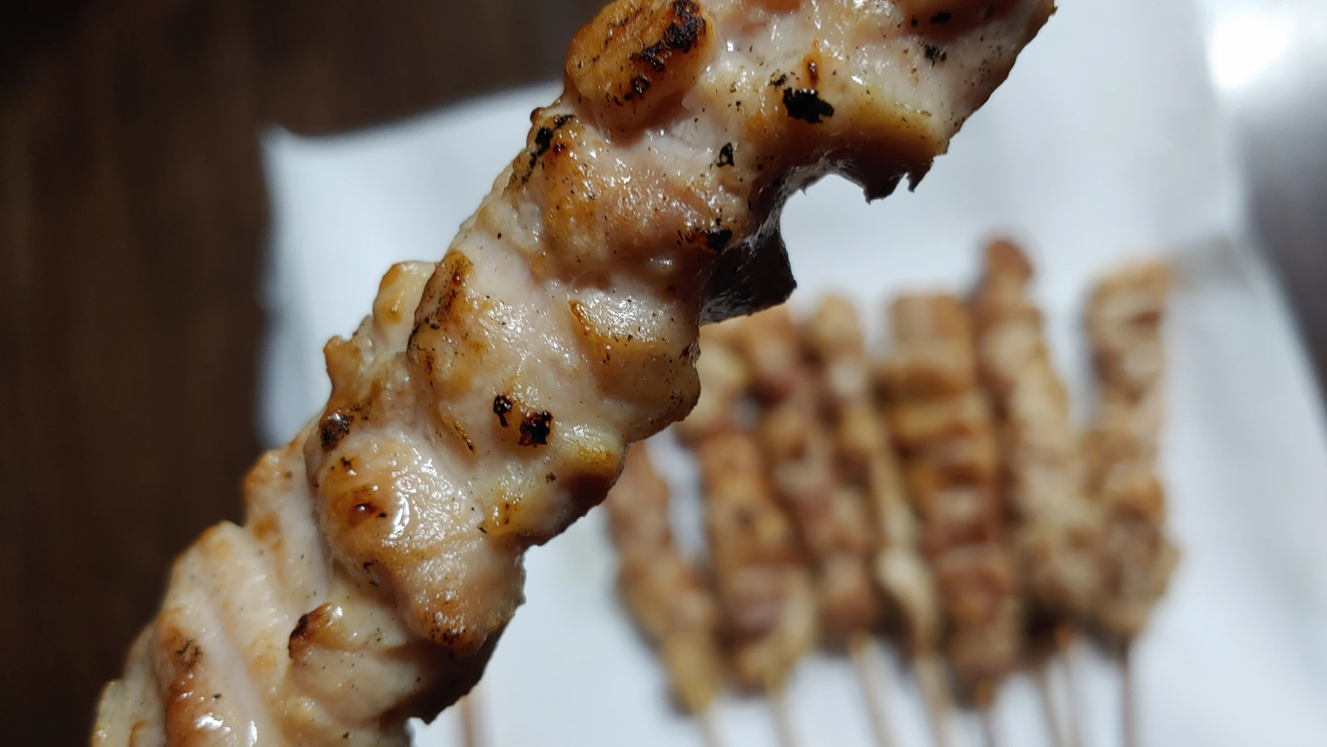 탄 부분은 여기서 태운 게 아니라 이미 그렇게 돼있었어요. 제품이름이 숯불닭꼬치라니 어쩔 수 없죠.